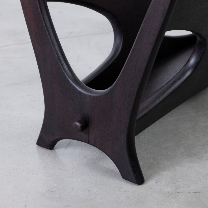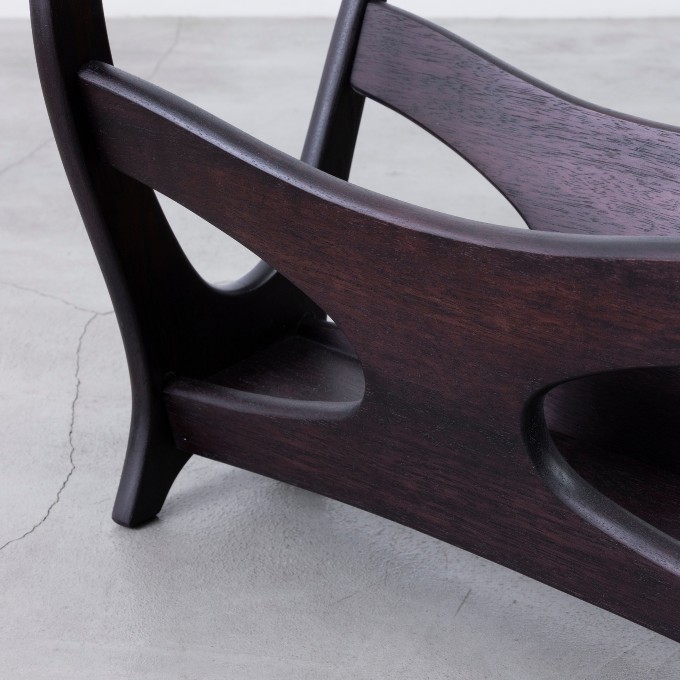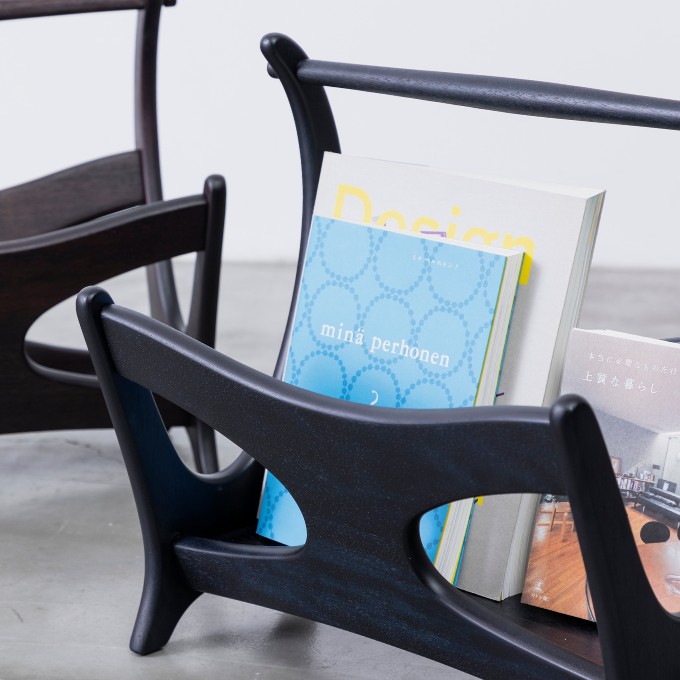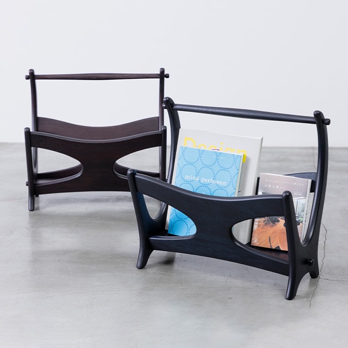 1960年代の発売当時は、世の中にマガジンラックというアイテムが出始めた頃で、マルニ木工もさまざまなデザインのマガジンラックを発売していた中の一つになります。正面に見えるシルエット、側面の脚がスッと伸びたデザインは秀逸。ラックの角度をちょっと変えるだけで、さまざまな表情を見せてくれます。高さがないので部屋に圧迫感を与えないのも嬉しいポイント。さりげなく置くだけで、何もないスペースが特別な場所に変わります。