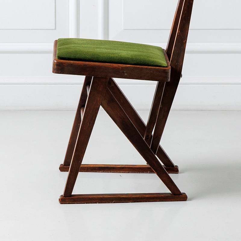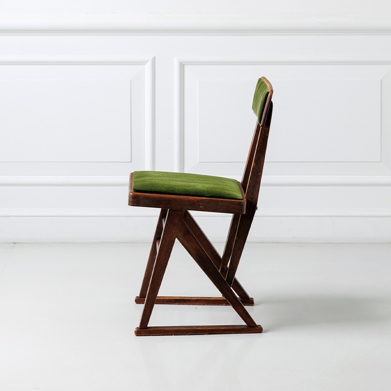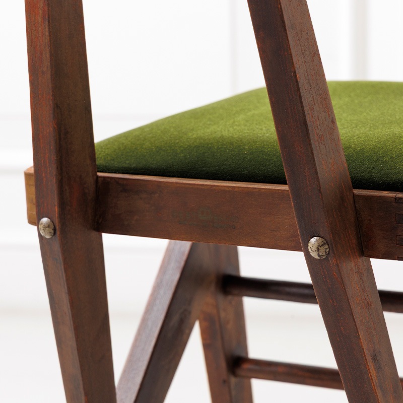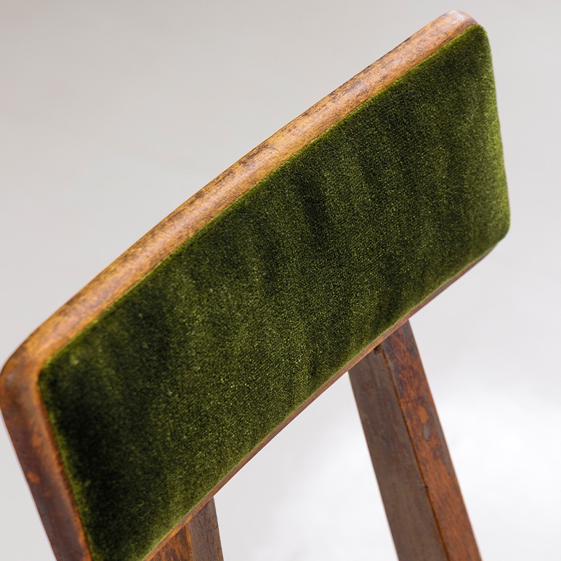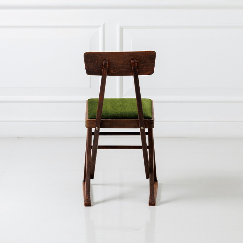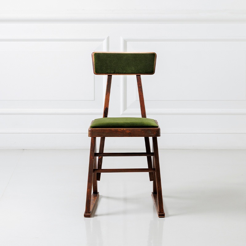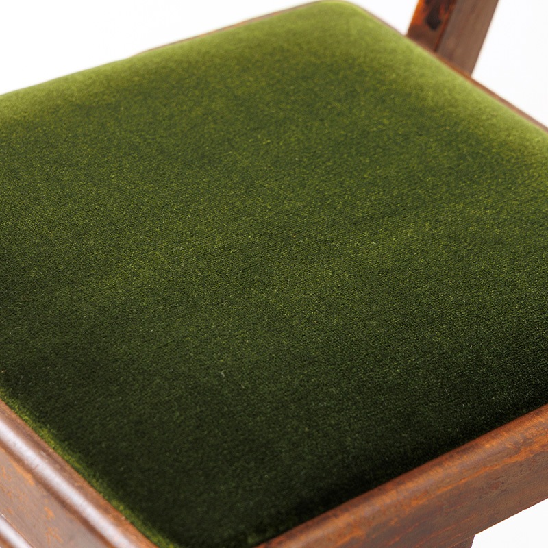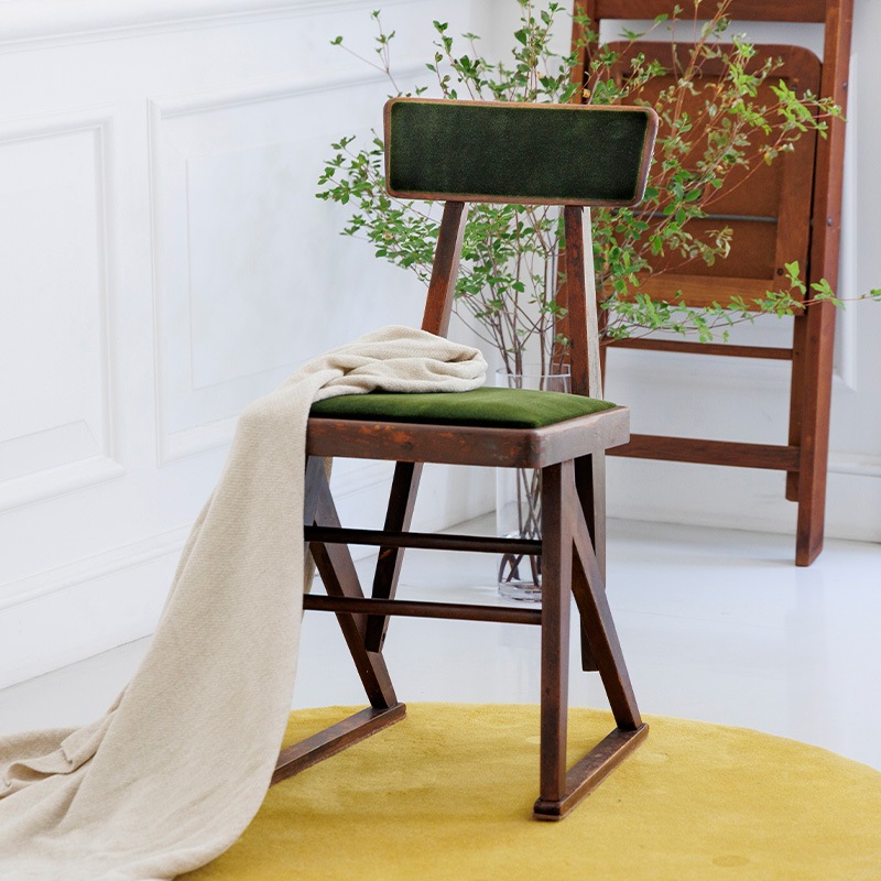 マルニ木工が1950年代に製作した「オリオン学習机」の専用の椅子をリメイクしたモデルです。昭和の時代、畳が主であった和室に合うようにできたサイズ感は、改めて今の時代に見ると斬新です。当時の木の雰囲気や経年変化の風合いはそのままに、古家具ならではの深い味わいをお楽しみいただくようにリノベーション。張地に選んだモケット生地の深みのあるグリーンは、レトロインテリアやミッドセンチュリーテイストとも相性抜群。ヴィンテージ家具を愛する方にもご満足いただける、唯一無二の存在感を持つチェアです。