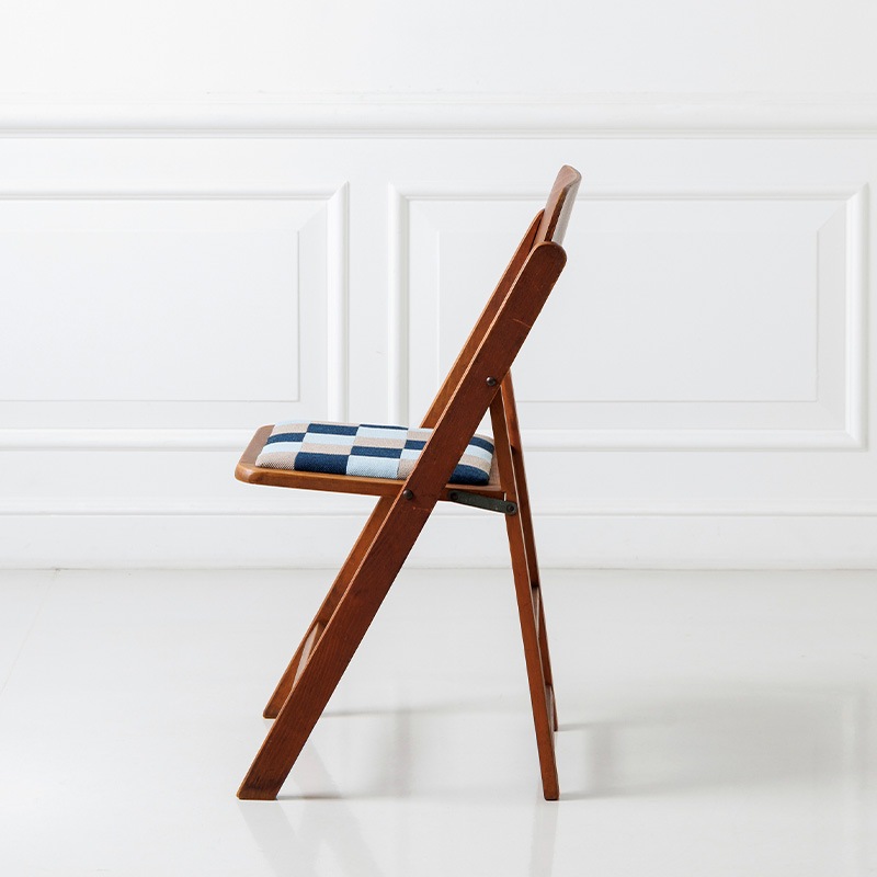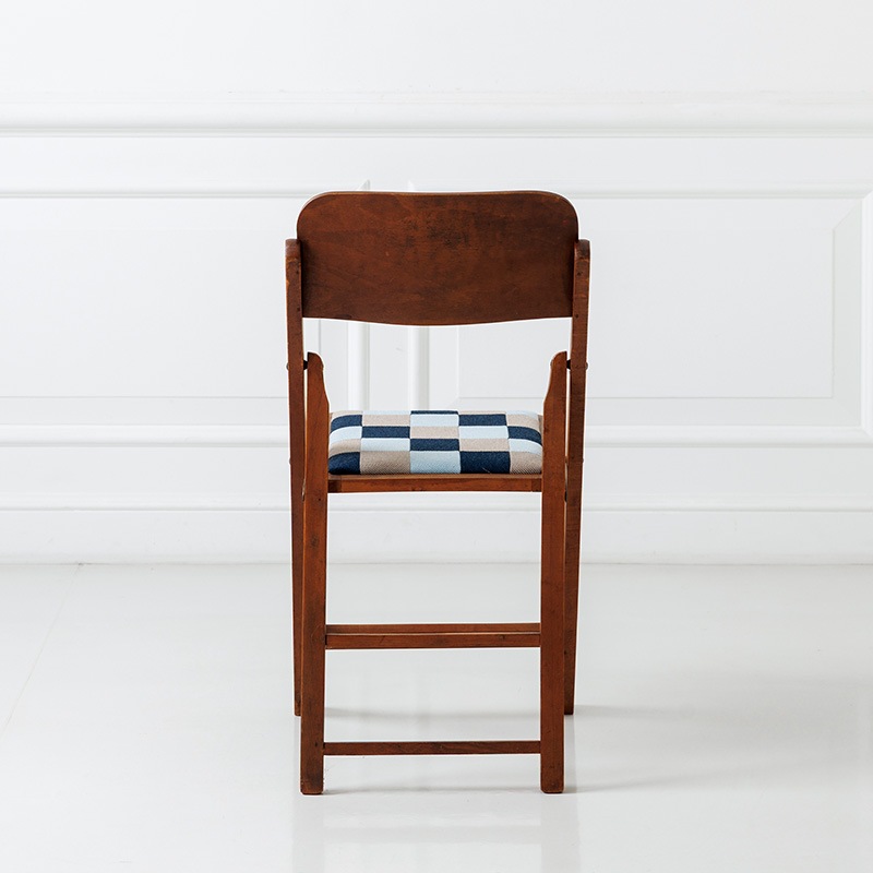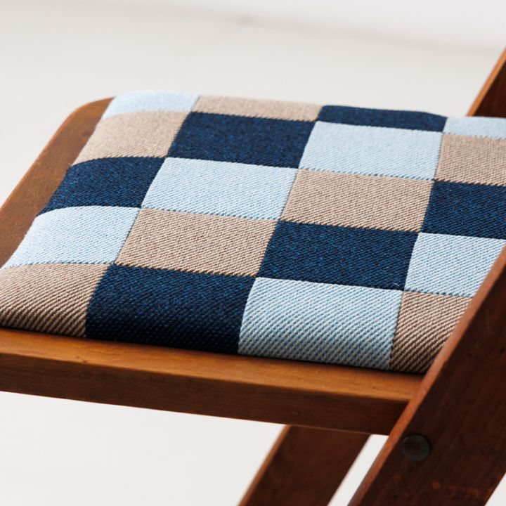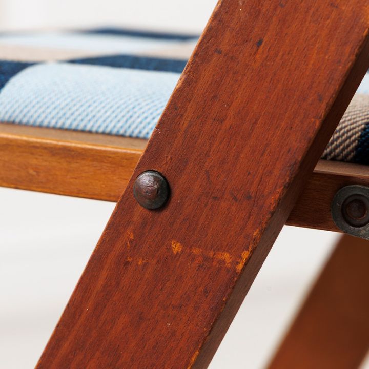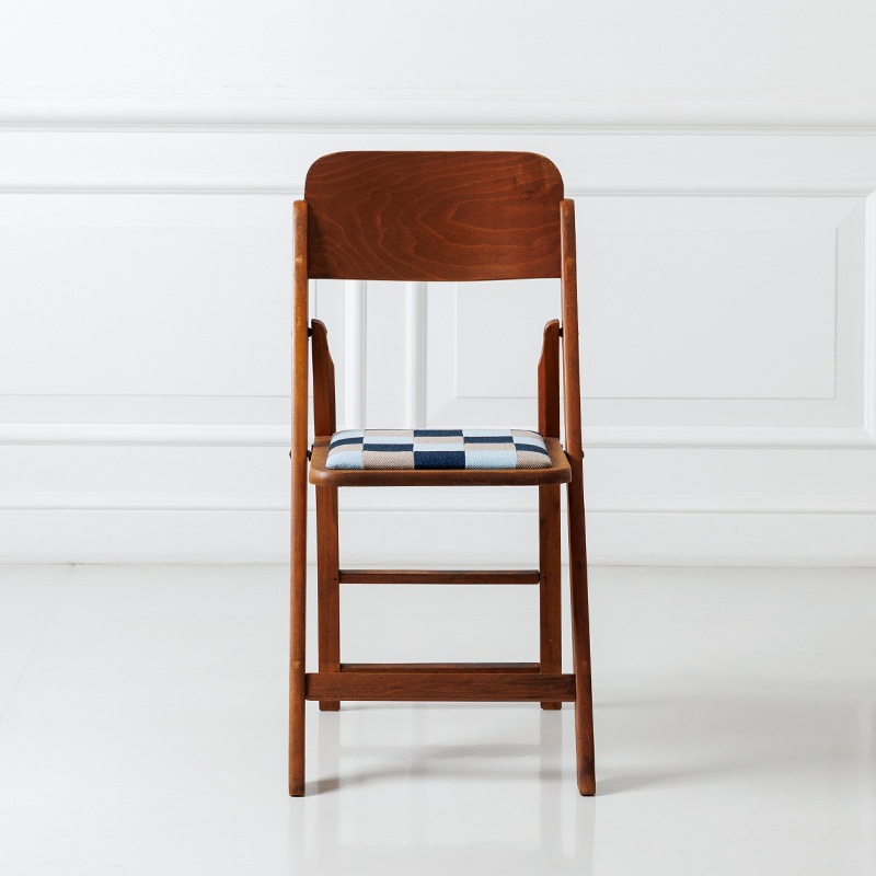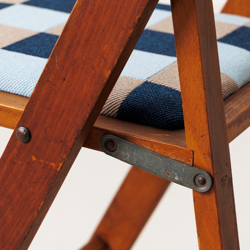 1960年代にマルニ木工が手がけた折りたたみ椅子をベースにリノベーション。レトロポップな木製チェアとなりました。座面には、糸を斜めに交差させて織る「綾織り(あやおり)」生地を組み合わせたオリジナルのパッチワークを張りました。木部はクリア塗装で仕上げ、木の温もりと当時のクラシックな空気感を残しどこか温かみのある雰囲気に。折りたたみ式で使い勝手が良く、家のどこでも活躍してくれる椅子です。