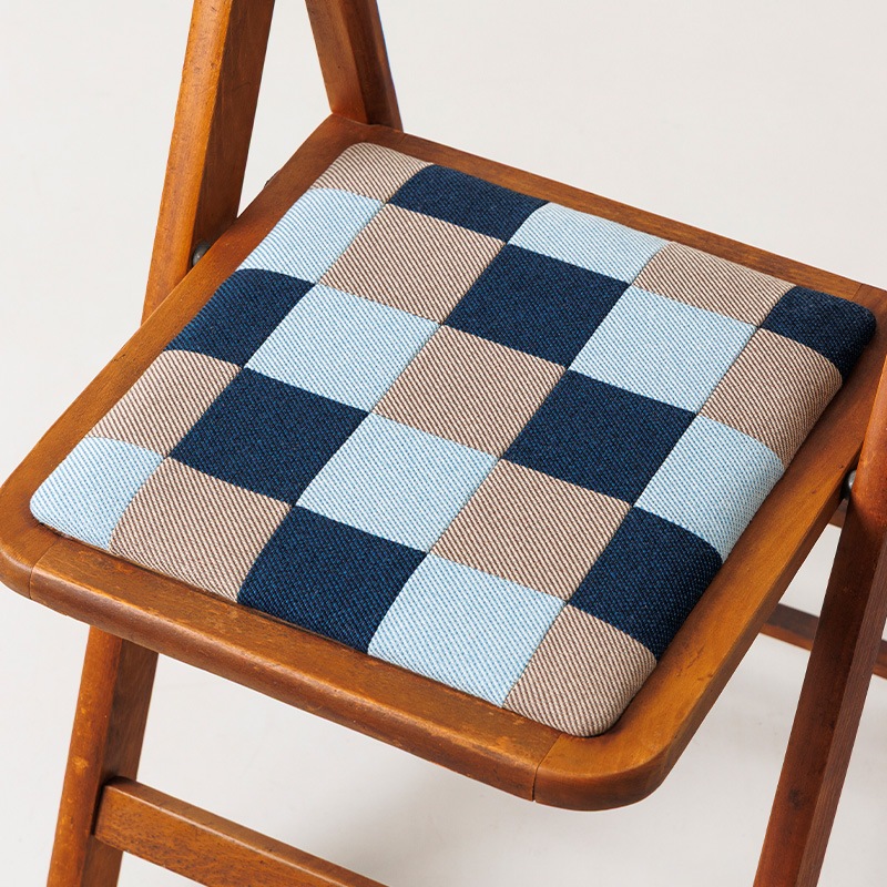 座面の張地は、工場で生まれる残反(ざんたん)を無駄にせず、新たな価値としてアップサイクルした“一点もの”のオリジナルテキスタイルです。 半端なサイズの生地を熟練の縫製職人が一枚ずつ丁寧にカットし組み合わせ、独自の色柄バランスを生み出したパッチワークは、まさに「一期一会」の仕上がり。 手間ひまを惜しまず製作した、世界に一つだけの特別な張地です。