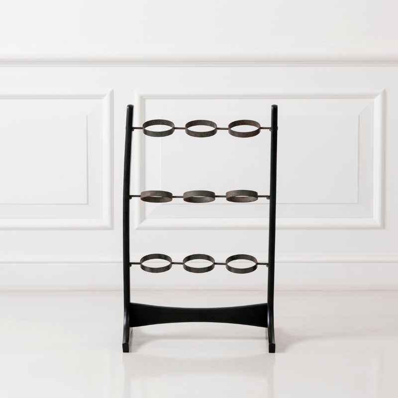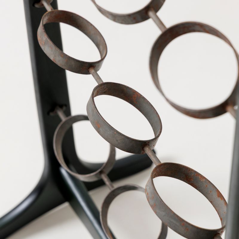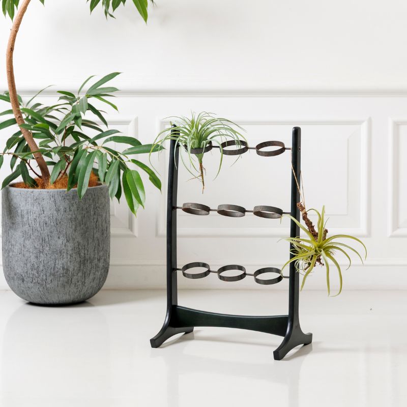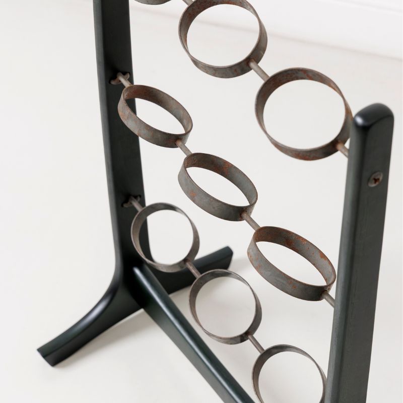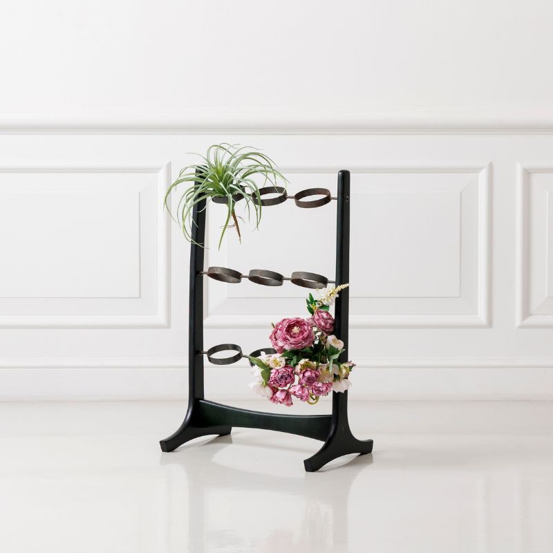 木のフレームに、経年変化によってところどころサビをまとった黒鉄のような質感のアイアンリングを組み合わせたディスプレイスタンド。直線的なフレームとやわらかな曲線のバランスが美しく、置くだけで空間に静かなリズムと奥行きを生み出します。