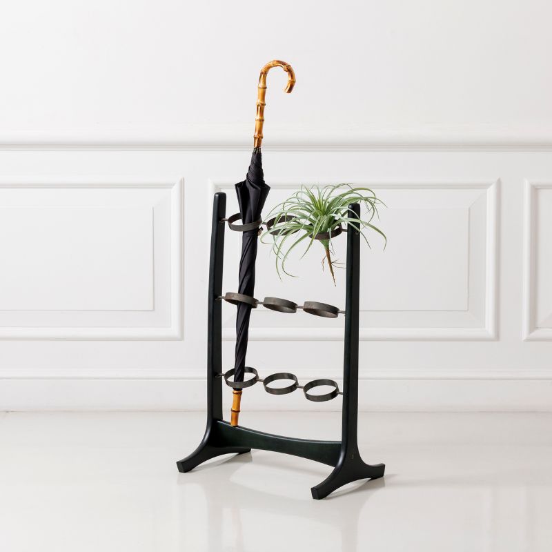 こちらのモデルは、1960年代にマルニ木工でスリッパ立てとして開発されたもの。当時のデザインを受け継ぎながら、現代の感性で自由に楽しめる一台です。リング部分にはグリーンやドライフラワー、オブジェを軽やかにディスプレイ。日傘を掛けたり、フックを添えて飾り方を広げるのもおすすめです。主張しすぎない佇まいで、住宅からショップやギャラリーの什器まで幅広く活躍します。