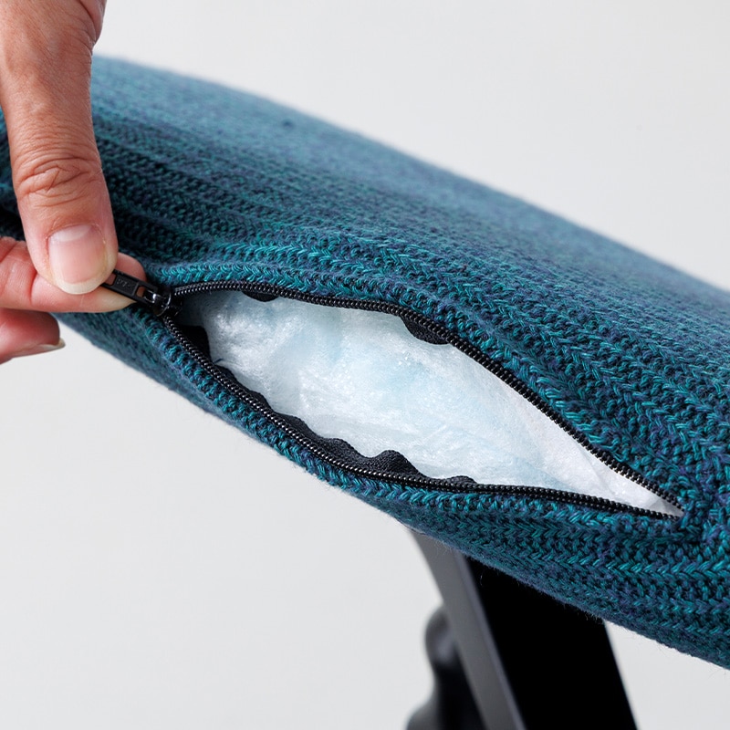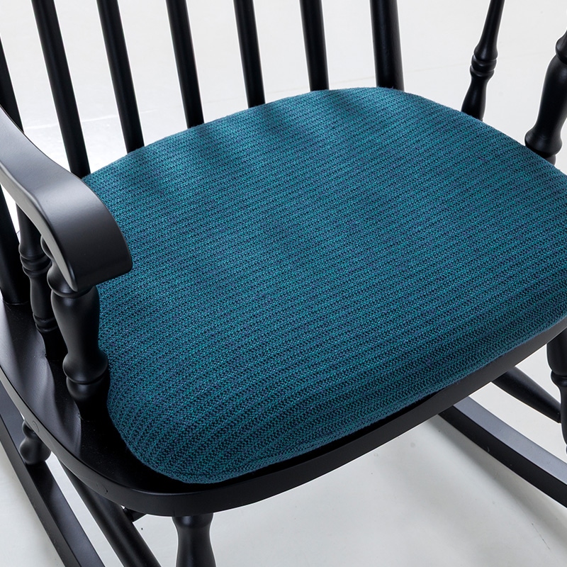 座面は広すぎない、すっきりとしたフォルム。フラットで安定感のある設計が、心地よい揺れをやさしく受け止めます。その快適さをさらに高めるために、このチェア専用の座面クッションをご用意しました。かたちに合わせて丁寧に型取りし、フィット感を追求した特別仕様です。生地には、シンコールの椅子張り生地「J.MODE」を採用。アクリルと麻を混紡した、質感豊かなファブリックです。今回は、ビリジアンとブルーが織りなすメランジ調を選定。奥行きのある色合いが、チェアの佇まいにさりげない彩りを添えます。